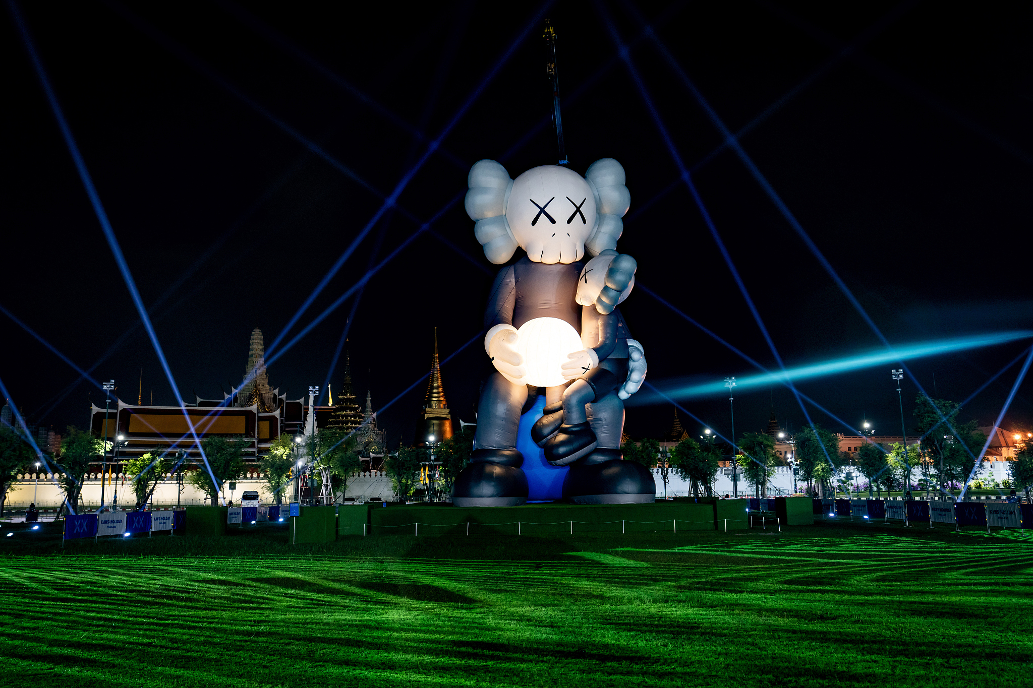 当地时间2025年5月16日,泰国曼谷,艺术家KAWS创作的18米高雕塑《伙伴》在大皇宫的圣兰广场进行日出前的排练(图片来源:视觉中国)这也就回应了为什么Labubu没有一个完整的世界观。谈到艺术时,他说每个时代都有自己的艺术。如果让现在的年轻人画水墨画、做紫砂壶,反而会让他们望而却步。反而是涂鸦、说唱、文身这些比较浅显易懂的形式,是这个时代年轻人眼中更酷、更有趣的方式。