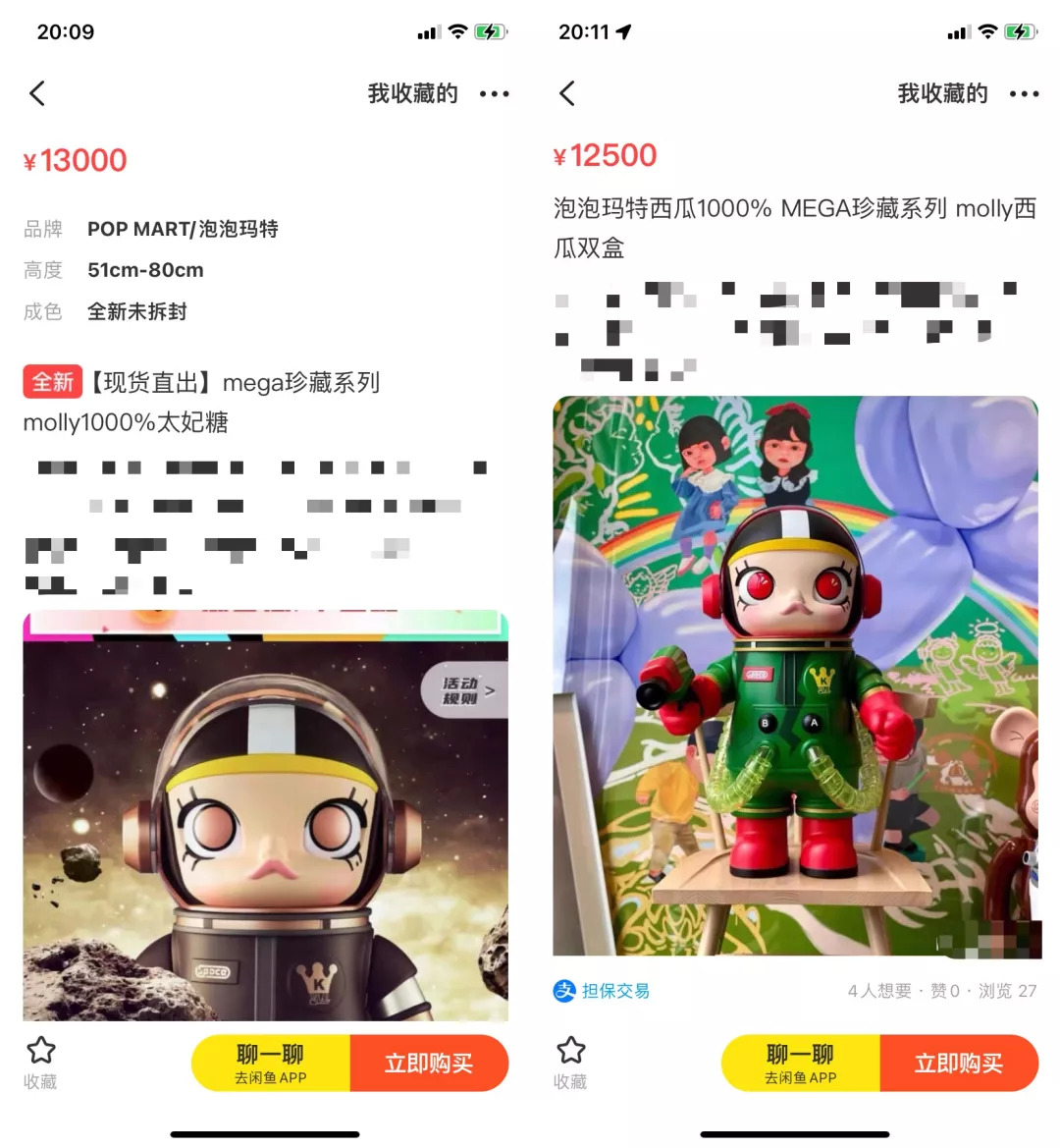与此同时,泡泡玛特过度的消费“Molly”,严重的依赖单一IP。推出同款“变大”的盲盒玩具,并且以限量版进行销售:据泡泡玛特官方数据,今年8月中旬推出的Space Molly西瓜和太妃糖两款大娃,仅在天猫一家平台,就有超过98万人参与产品抽签。这种销售策略可以说相当成功,大娃的二手价格甚至被追捧到数万元。
