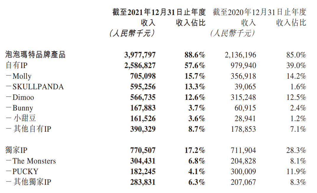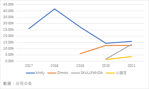 Dimoo最早出现在财报中是在2019年,当年的营收占比为5.9%,在2020年的占比增长到12.5%,2021年的占比为12.6%。