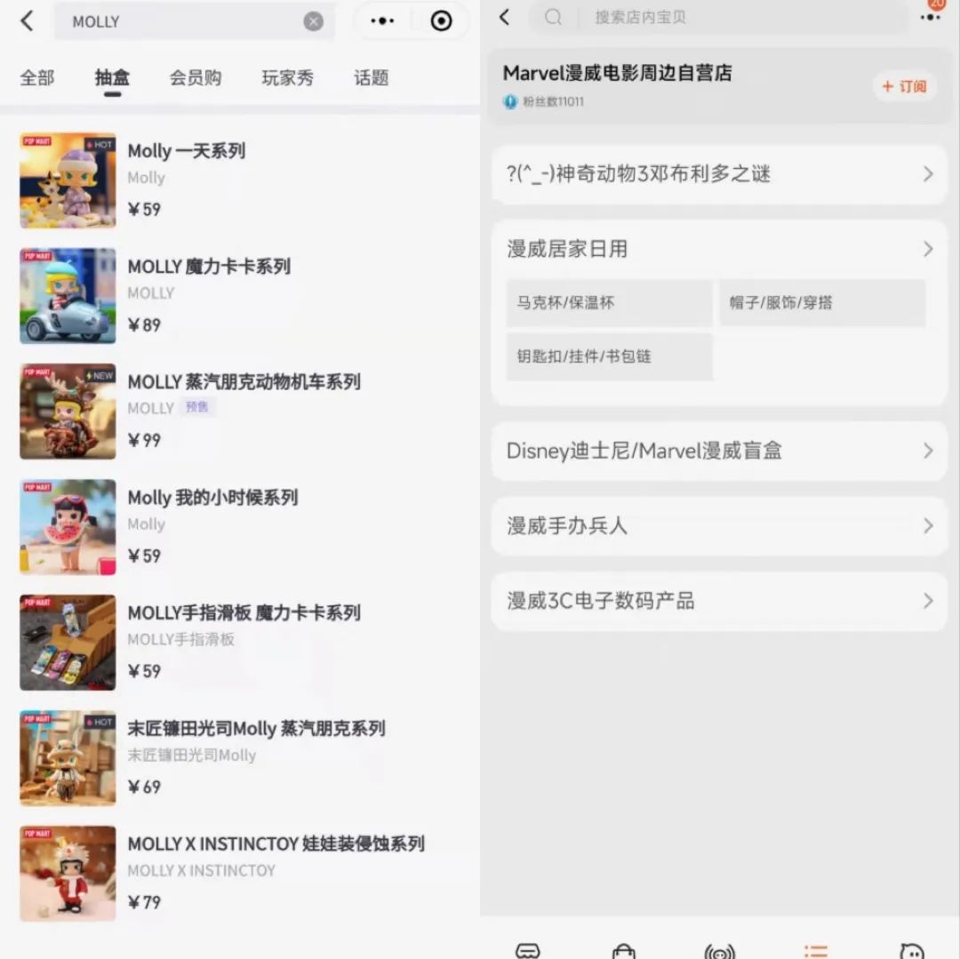 以漫威为例,除了广为人知的电影产品,它还有多种多样的商品,常见的有衣服、3C数码、手办等。而泡泡玛特的IP,至今仍只有“娃娃”这一种消费形态。